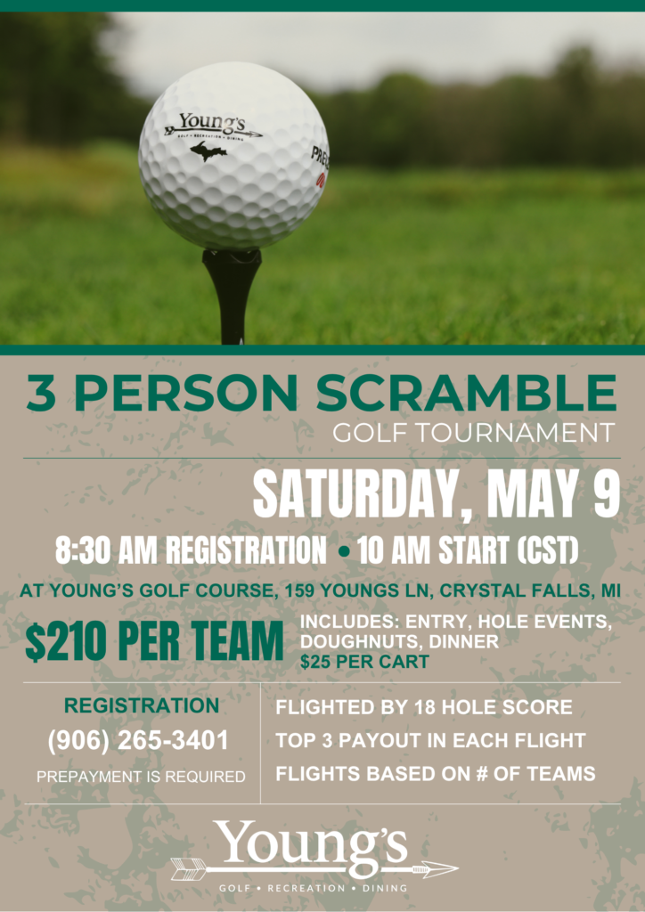 Register online at https://app.eventcaddy.com/events/young-s-3-person-scramble?fbclid=IwY2xjawRDgApleHRuA2FlbQIxMABicmlkETE1YUtOVnhOeXFxV05MdmdOc3J0YwZhcHBfaWQQMjIyMDM5MTc4ODIwMDg5MgABHh3f0NAkQEHAYIZeyzRP485aFxqTq8voxlSsZyOeVWcPWFSgnWe7X4q-ZAsi_aem__dsW4G4HmK1OqATnl0dkog