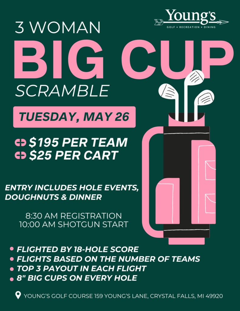 Prepayment is required. Call (906) 265-3401 ext 1. or visit https://app.eventcaddy.com/events/young-s-3-woman-big-cup-scramble